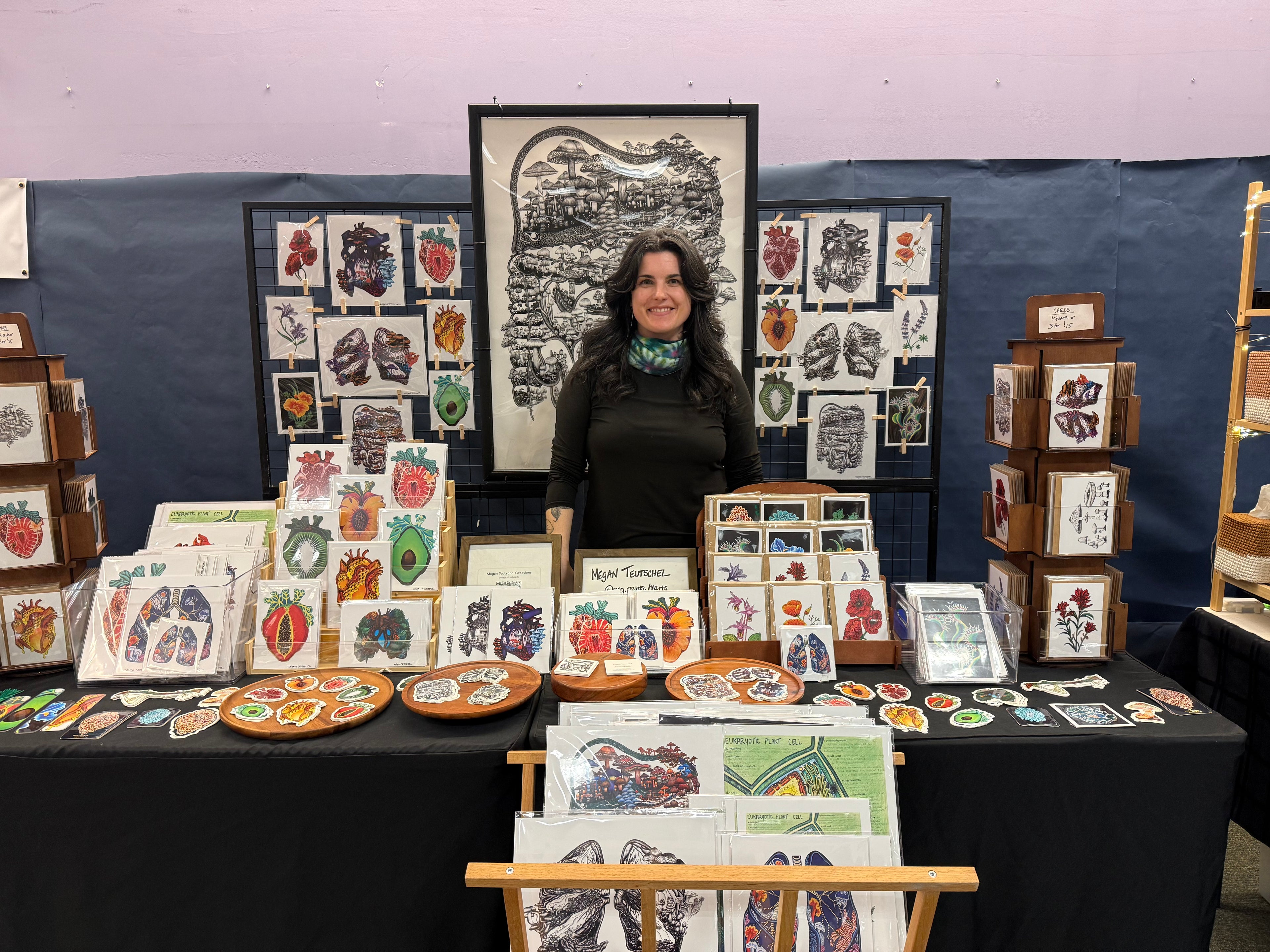 Megan Teutschel ("two-shell") is based in Olympia, WA and has been making art centered around the Pacific Northwest as Meg Paints Hearts since 2018. Drawing on inspiration from nature and her background working in medicine, the art of Meg Paints Hearts started with anatomical drawings and slowly began to integrate the fungi and flora of the West Coast.
