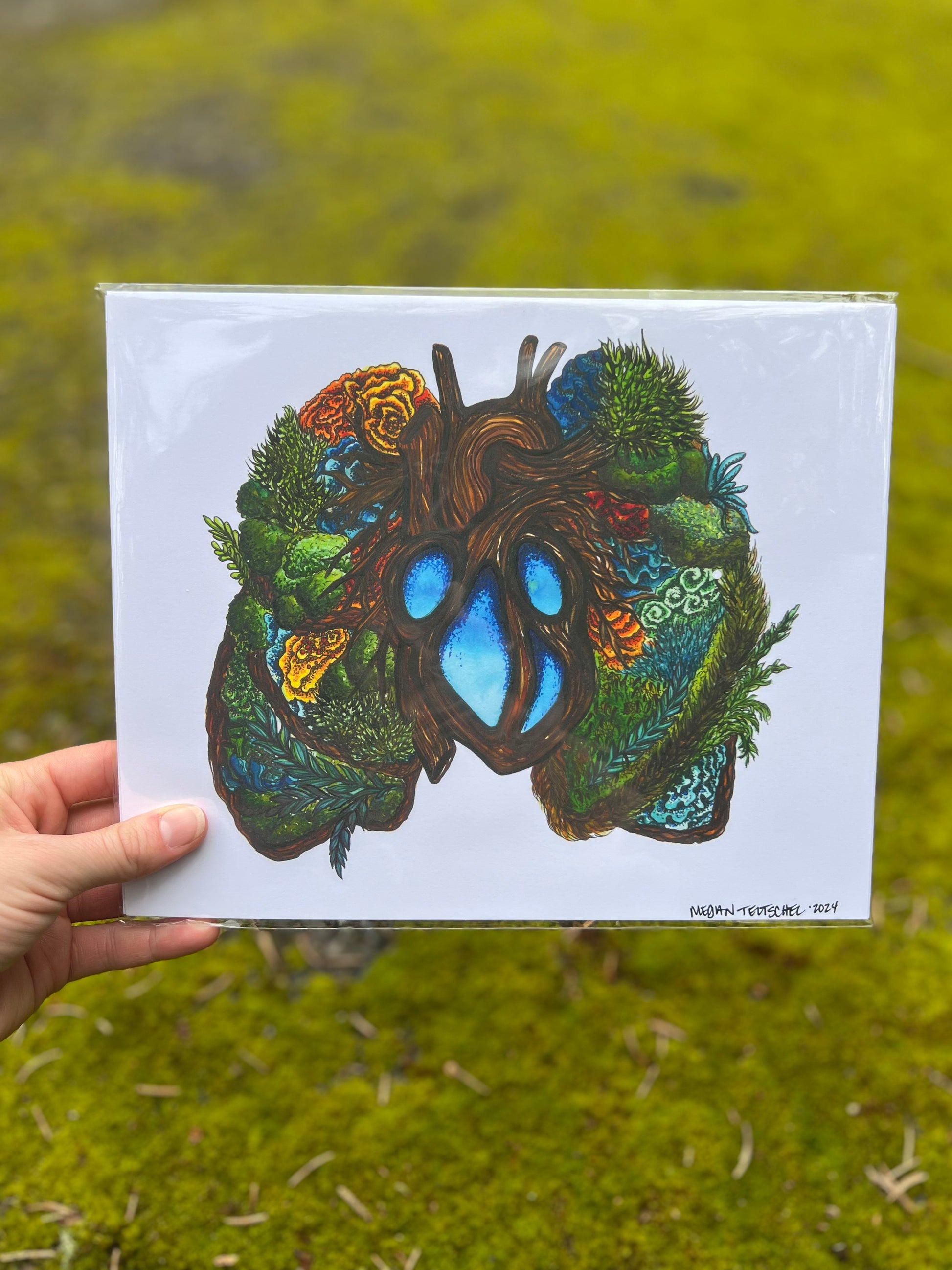 This work features a wooden heart with lichen and moss lungs that are intertwined. Our connection to the forest is not just through the trees, but also by the soil, mushrooms and moss that coat the forest floor.