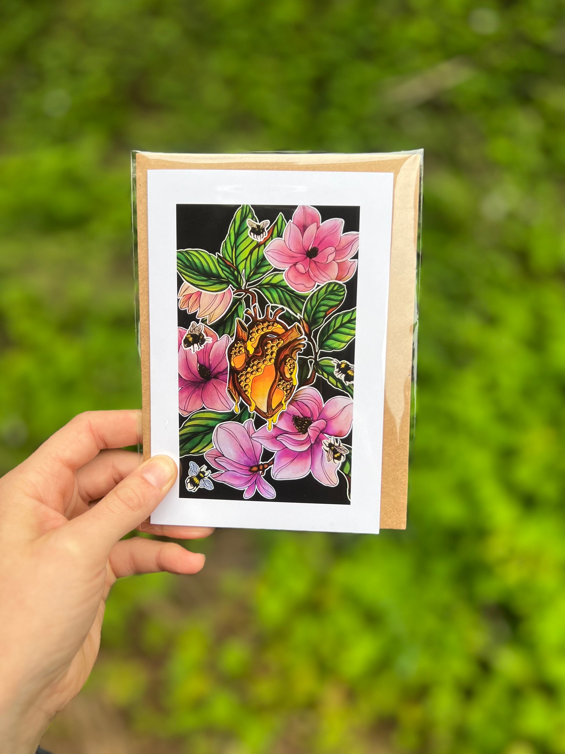 The Honeycomb Heart on Black is part of a larger piece of art that also features magnolias and bees. The heart was made with watercolor and micron pen while the rest of the piece is mixed media. Honey and bees have always been very whimsical and combining them with an anatomical heart transports me to the sticky sweetness of summertime.
